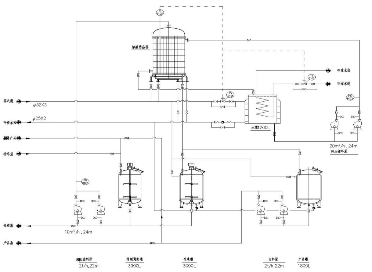 若不帶殘渣洗滌分離系統, 若加的料是較純的,這樣將損失產(chǎn)品, 因此需分離殘渣, 以提高收率。過(guò)程產(chǎn)生的廢蒸汽相應可濃縮雜質(zhì), 實(shí)際上, 每批加工收集到的殘渣積存到可裝滿(mǎn)結晶器時(shí)再加工, 可以用多級洗滌分離進(jìn)一步減少殘渣量。在多級殘渣中,共熔點(diǎn)組分都是相近的, 所以可一起回收。