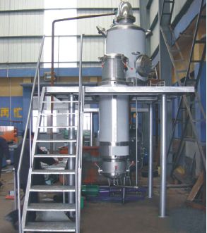 如:果汁自加熱器體的底部進(jìn)入管內,加熱蒸汽在管間傳熱及冷凝,將熱量傳給管內料液。料液被加熱沸騰,便迅速汽化,所產(chǎn)生的二次蒸汽及料液,在管內高速上升。在減壓真空狀態(tài)下,管的出口處二次蒸汽速度一般可達100~160米/秒,濃縮被高速上升的二次蒸汽所帶動(dòng),沿管內壁成膜狀上升不斷被加熱蒸發(fā)。這樣料液從加熱器底部至管子頂部出口處,逐漸被濃縮,濃縮液并以較高速度進(jìn)入蒸發(fā)分離室,在離心力作用下與二次蒸汽分離,二次蒸汽從分離室頂部排出,濃縮液一部分通過(guò)循環(huán)管,再進(jìn)入加熱器體底部,繼續濃縮,另一部分達到濃縮度的濃縮液,可從分離室底部放出。也有進(jìn)料經(jīng)一次濃縮后,達到成品濃度而排出。